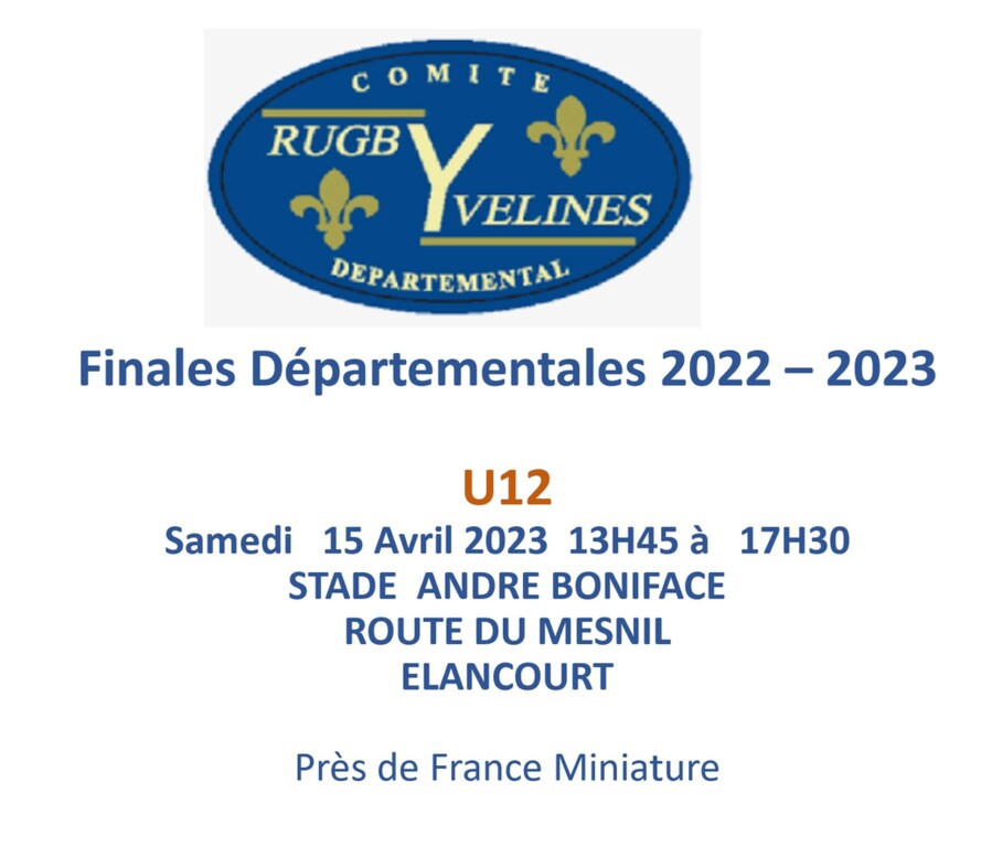 Samedi 15 avril 2023 aura lieu, au stade Andre BONIFACE - Rue du Mesnil - à Elancourt ( derrière France Miniature ), la finale départementale U12 qui réunira pour un tournoi l'ensemble des clubs du département.
