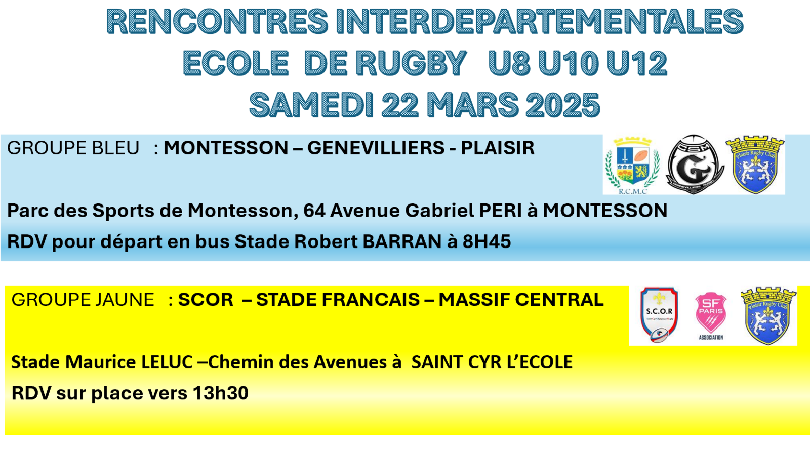 Nous vous donnons rendez-vous à 8h45 au stade Robert Barran à PLAISIR pour un départ en Bus ( ou directement à MONTESSON à 9h45)