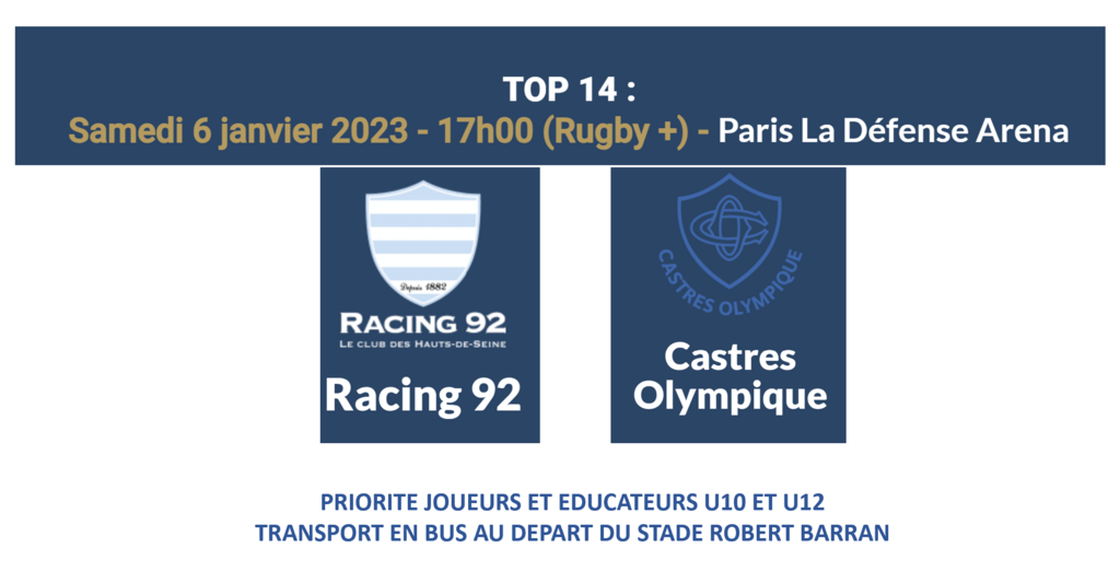 Nous avons le plaisir de vous inviter pour le match RACING CASTRES qui aura lieu samedi 6 Janvier 2024 à 17h00 à Paris la Défense Arena